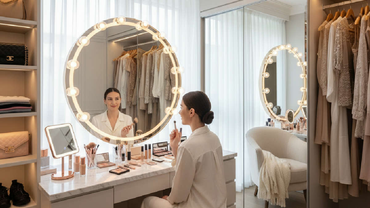 A melhor iluminação para um camarim é a luz neutra (4000K-5000K), disposta frontalmente ao redor do espelho, simulando a luz natural. Isso elimina sombras e garante a percepção correta das cores dos produtos de maquiagem.